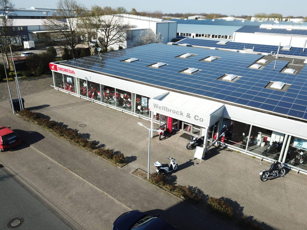Elektromotorräder liegen voll im Zeitgeist. Auch Honda macht unter den Herstellern keine Ausnahme und hat schon eines präsentiert. Umso wichtiger, dass sich Händler auf den künftigen Elektroantrieb vorbereiten. Die Wellbrock & Co. GmbH aus Lilienthal bei Bremen, Honda-Vertragshändler und eines der größten Motorradhäuser Deutschlands, geht hier klar als Trendsetter voran: Neben Plätzen zum Aufladen für E-Motorräder für Team und Kunden wurde jetzt auch die schon lange existierende PV-Anlage erweitert und um Stromspeicher, BHKW und Klimaanlagen ergänzt, um den Eigenverbrauch zu maximieren.